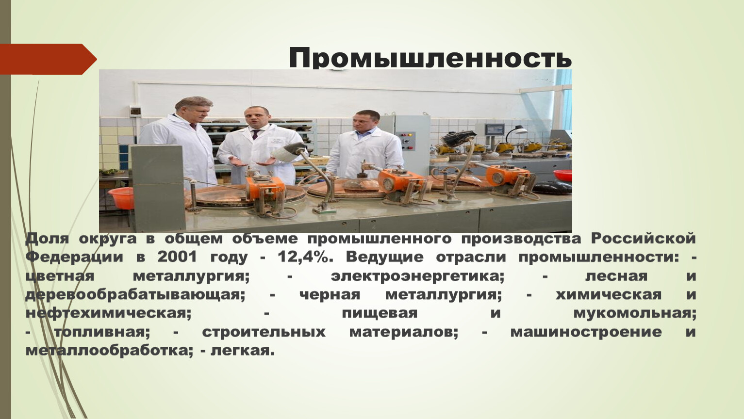 Доля округа в общем объеме промышленного производства Российской Федерации в 2001 году - 12,4%. Ведущие отрасли промышленности: - цветная металлургия; - электроэнергетика; - лесная и деревообрабатывающая; - черная металлургия; - химическая и нефтехимическая; - пищевая и мукомольная;- топливная; - строительных материалов; - машиностроение и металлообработка; - легкая.