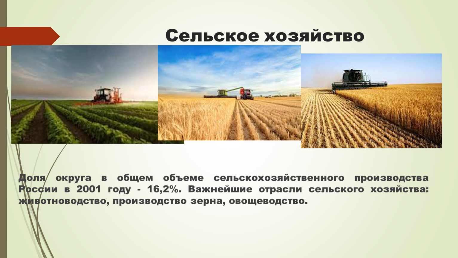 Доля округа в общем объеме сельскохозяйственного производства России в 2001 году - 16,2%. Важнейшие отрасли сельского хозяйства: животноводство, производство зерна, овощеводство.
