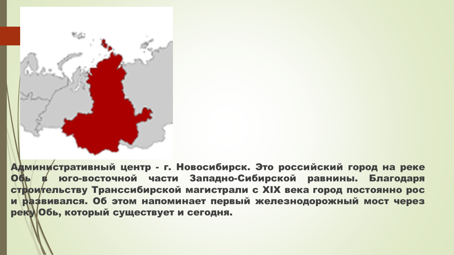 Административный центр - г. Новосибирск. Это российский город на реке Обь в юго-восточной части Западно-Сибирской равнины. Благодаря строительству Транссибирской магистрали с XIX века город постоянно рос и развивался. Об этом напоминает первый железнодорожный мост через реку Обь, который существует и сегодня.