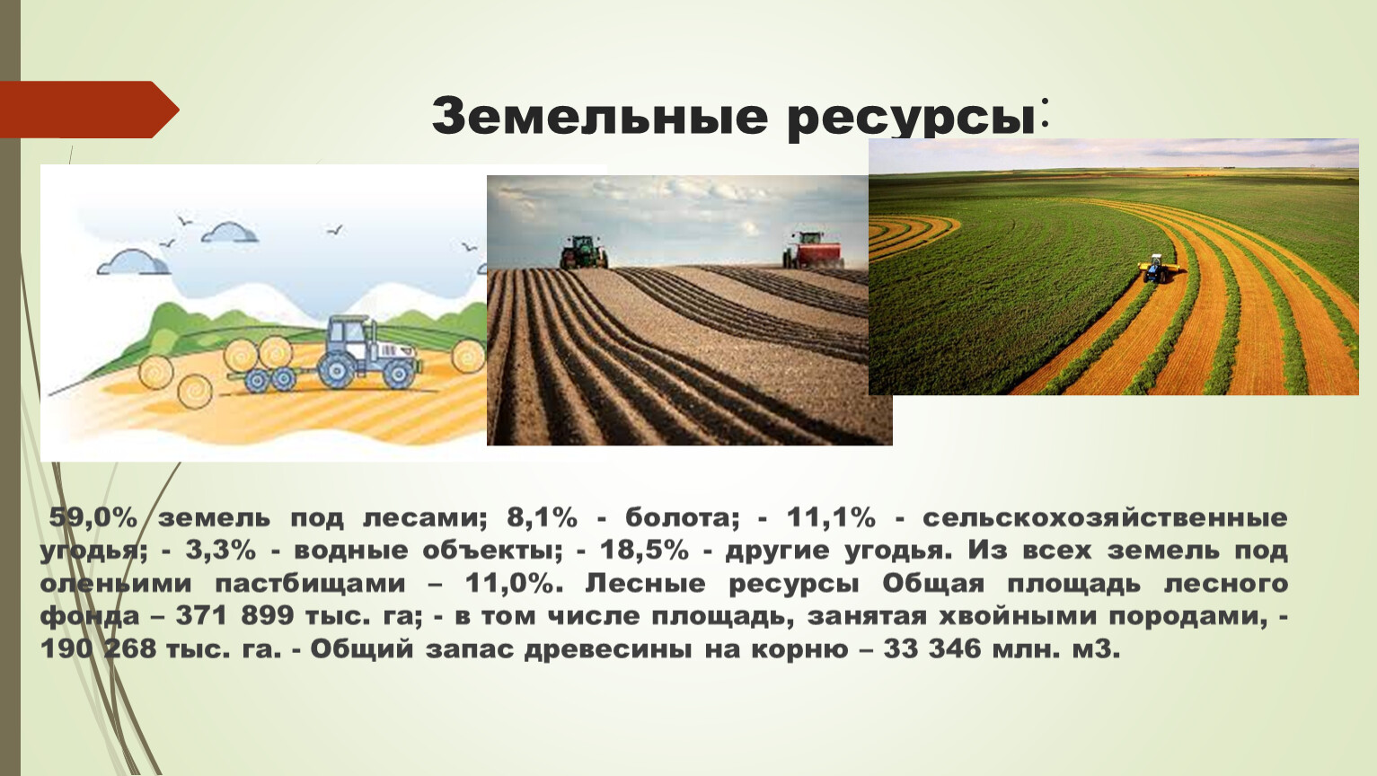 59,0% земель под лесами; 8,1% - болота; - 11,1% - сельскохозяйственные угодья; - 3,3% - водные объекты; - 18,5% - другие угодья. Из всех земель под оленьими пастбищами – 11,0%. Лесные ресурсы Общая площадь лесного фонда – 371 899 тыс. га; - в том числе площадь, занятая хвойными породами, - 190 268 тыс. га. - Общий запас древесины на корню – 33 346 млн. м3.