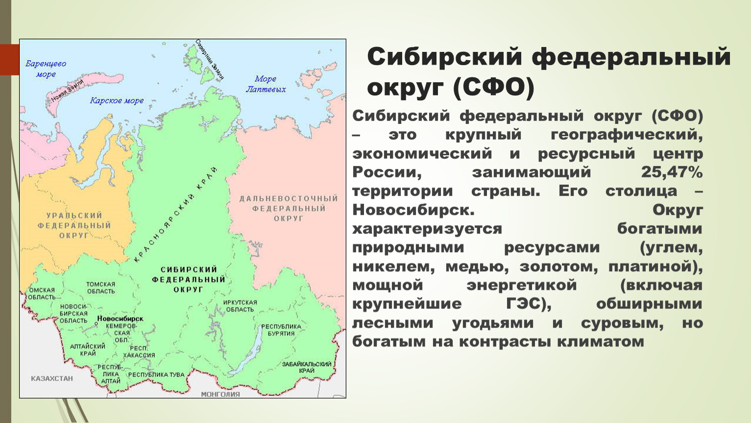 Сибирский федеральный округ (СФО) – это крупный географический, экономический и ресурсный центр России, занимающий 25,47% территории страны. Его столица – Новосибирск. Округ характеризуется богатыми природными ресурсами (углем, никелем, медью, золотом, платиной), мощной энергетикой (включая крупнейшие ГЭС), обширными лесными угодьями и суровым, но богатым на контрасты климатом