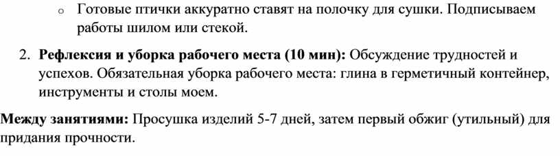 4. Рефлексия и уборка рабочего места (10 мин): Обсуждение трудностей и успехов. Обязательная уборка рабочего места: глина в герметичный контейнер, инструменты и столы моем.