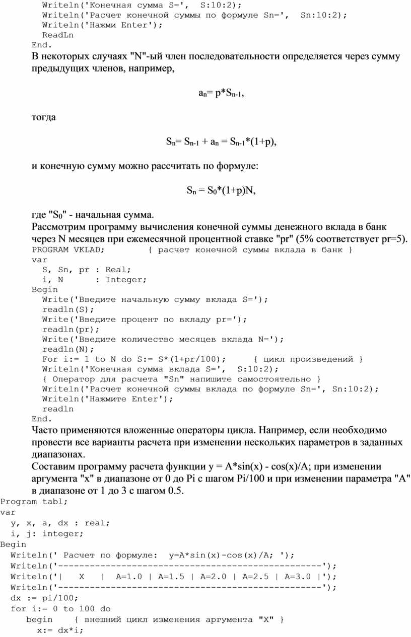 For i:= 1 to N do S:= S*(1+pr/100); { цикл произведений }
