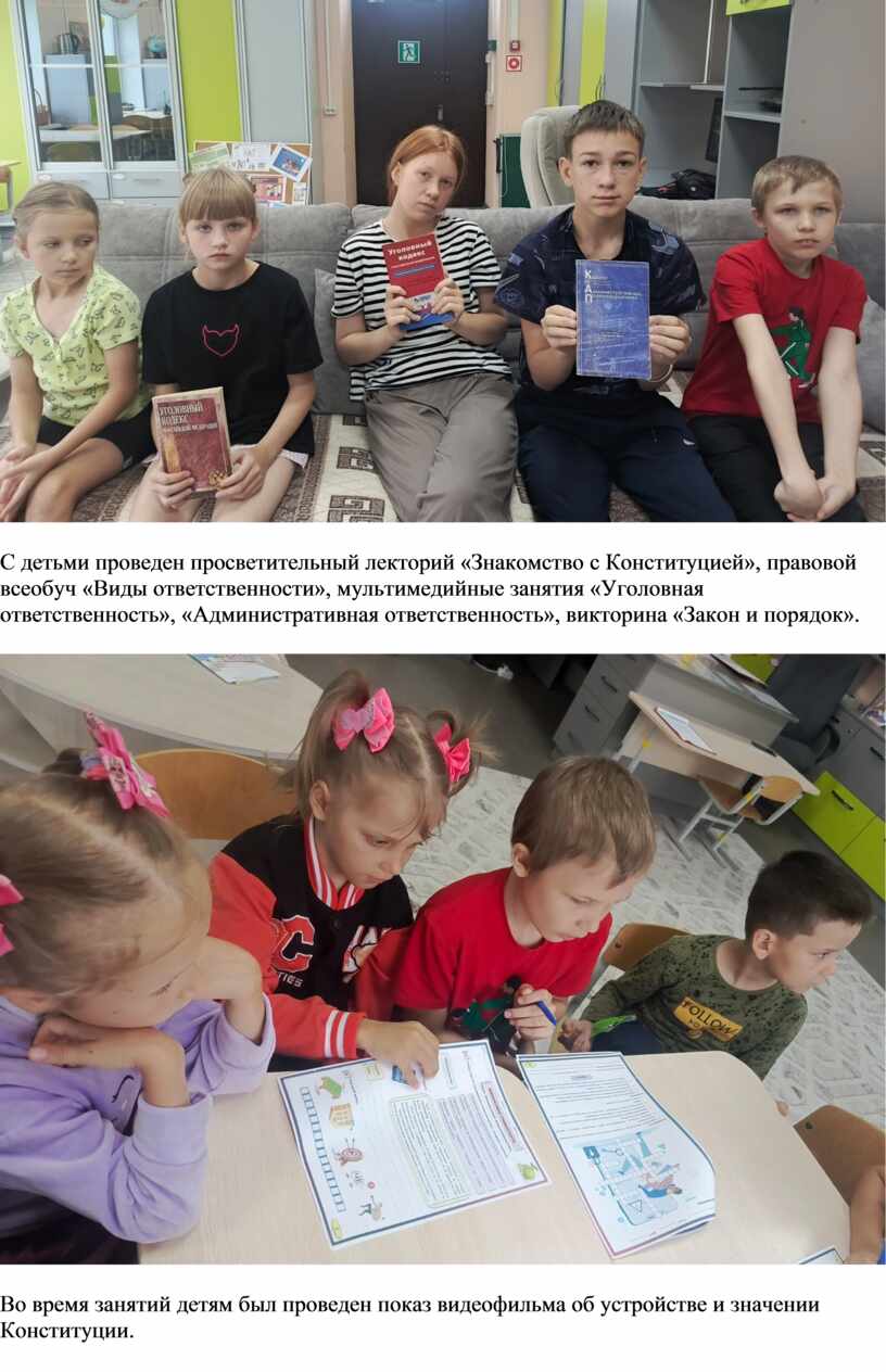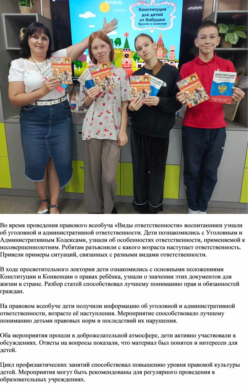 С детьми проведен просветительный лекторий «Знакомство с Конституцией», правовой всеобуч «Виды ответственности», мультимедийные занятия «Уголовная ответственность», «Административная ответственность», викторина «Закон и порядок».