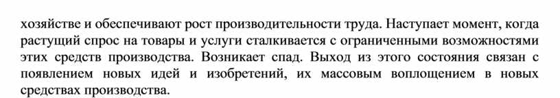хозяйстве и обеспечивают рост производительности труда. Наступает момент, когда растущий спрос на товары и услуги сталкивается с ограниченными возможностями этих средств производства. Возникает спад. Выход из этого состояния связан с появлением новых идей и изобретений, их массовым воплощением в новых средствах производства.