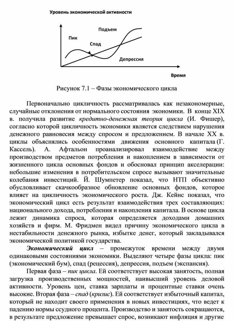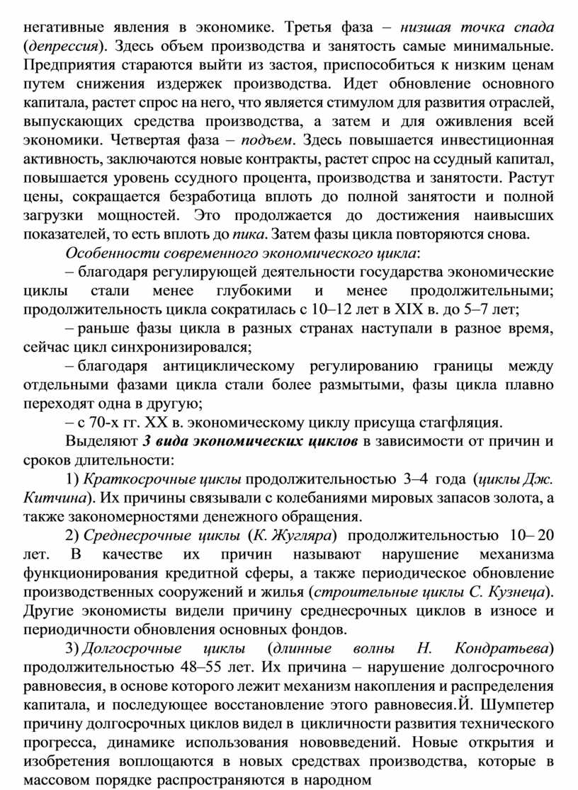негативные явления в экономике. Третья фаза – низшая точка спада (депрессия). Здесь объем производства и занятость самые минимальные. Предприятия стараются выйти из застоя, приспособиться к низким ценам путем снижения издержек производства. Идет обновление основного капитала, растет спрос на него, что является стимулом для развития отраслей, выпускающих средства производства, а затем и для оживления всей экономики. Четвертая фаза – подъем. Здесь повышается инвестиционная активность, заключаются новые контракты, растет спрос на ссудный капитал, повышается уровень ссудного процента, производства и занятости. Растут цены, сокращается безработица вплоть до полной занятости и полной загрузки мощностей. Это продолжается до достижения наивысших показателей, то есть вплоть до пика. Затем фазы цикла повторяются снова.