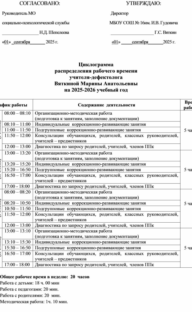 Общее рабочее время в неделю: 20 часов