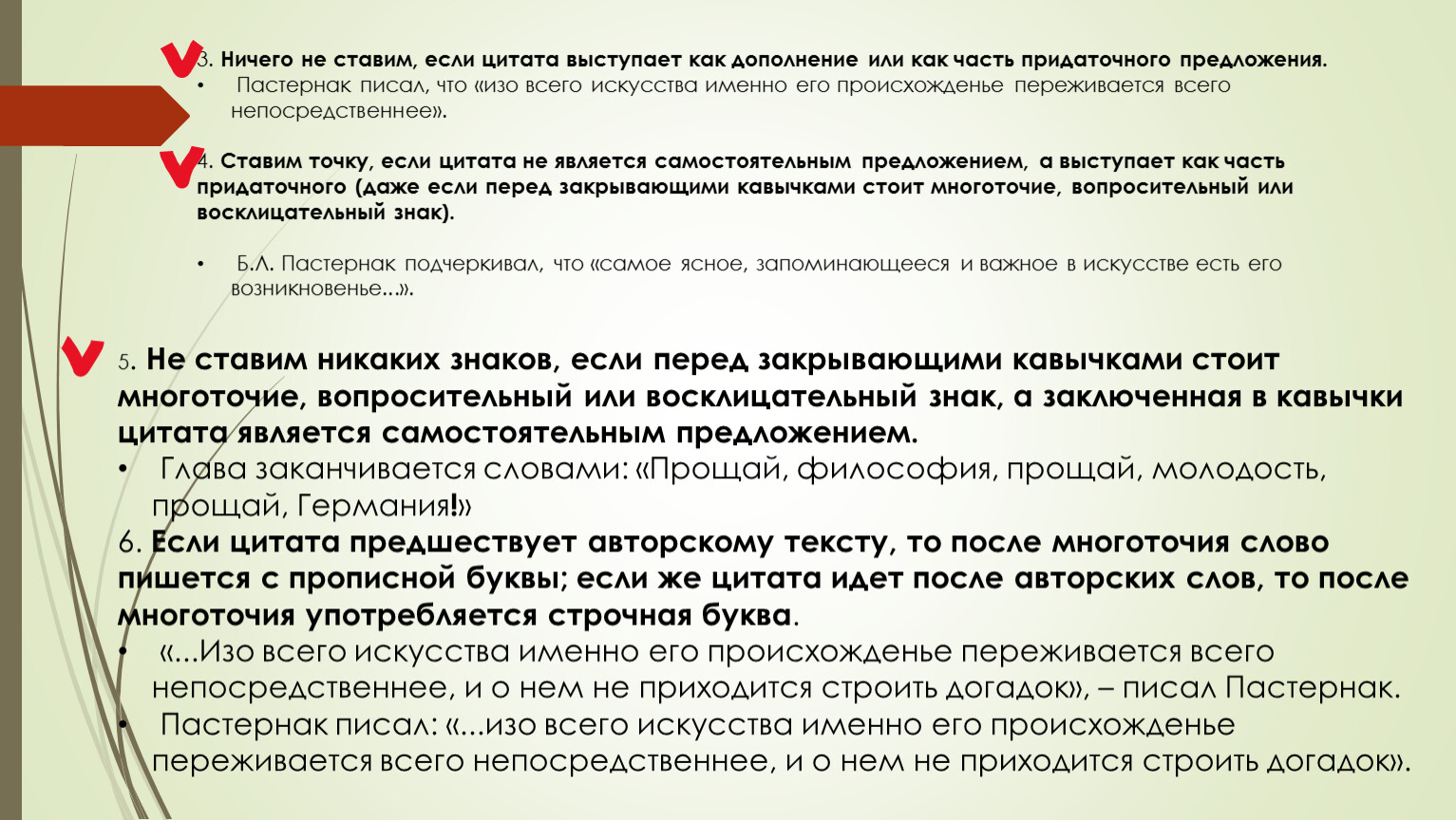 5. Не ставим никаких знаков, если перед закрывающими кавычками стоит многоточие, вопросительный или восклицательный знак, а заключенная в кавычки цитата является самостоятельным предложением.