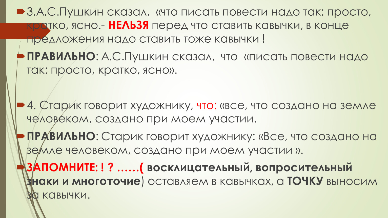 3.А.С.Пушкин сказал, «что писать повести надо так: просто, кратко, ясно.- НЕЛЬЗЯ перед что ставить кавычки, в конце предложения надо ставить тоже кавычки !