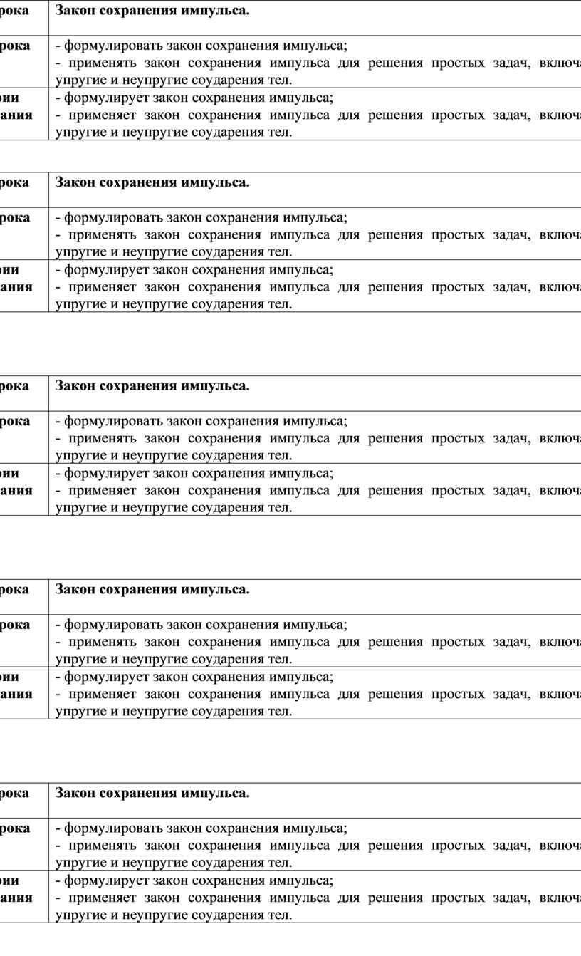 - формулировать закон сохранения импульса; - применять закон сохранения импульса для решения простых задач, включая упругие и неупругие соударения тел. |