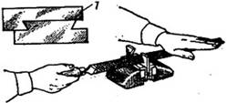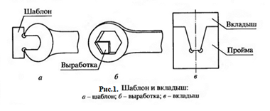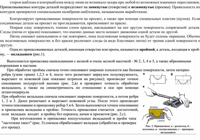 деталей до пригонки и припасовки должна быть обработана в пределах заданной точности. Это одна из наиболее трудоемких операций в работе слесаря. Припасовке подвергают шаблоны, контршаблоны, матрицы и пуансоны штампов и др. У шаблона и контршаблона рабочие части должны быть припасованы весьма точно, так, чтобы при соединении припасованных сторон шаблона и контршаблона между ними не возникало зазора при любой из возможных взаимных перестановок. Припасовываемые контуры деталей подразделяют на замкнутые (отверстия) и незамкнутые (проемы). Правильность их контуров проверяется специальными калибрами-шаблонами, называемыми выработками. Контролируют припасованные поверхности на просвет, а также при помощи специальных пластин (щупов). Если соединяемые детали на просвет не проглядываются, припиливают по краске. Покрыв одну поверхность тонким слоем краски, накладывают на нее другую поверхность сопрягаемой детали. Следы (пятна от краски) показывают, что именно данные места мешают движению одной детали по другой. Пятна снимают напильником и так повторяют, пока подгоняемая поверхность не будет сплошь окрашена. Обычно на подгоняемых поверхностях и без краски различают следы (в виде блестящих пятен) от трения одной поверхности о другую. Одна из припасовываемых деталей, имеющая отверстие или проем, называется проймой, а деталь, входящая в пройму, — вкладышем (рис.1). Выполняется припасовка напильниками с мелкой и очень мелкой насечкой - № 2, 3, 4 и 5, а также абразивными порошками и пастами. При обработке проймы сначала точно опиливают широкие плоскости как базовые поверхности, затем начерно