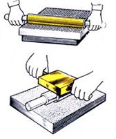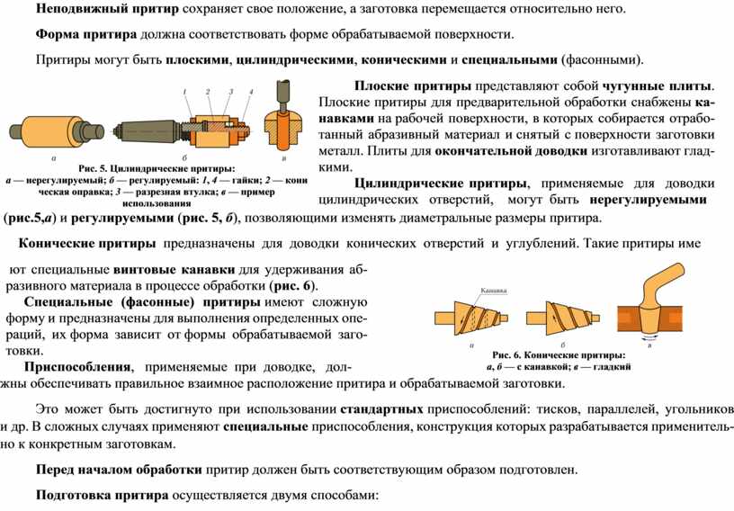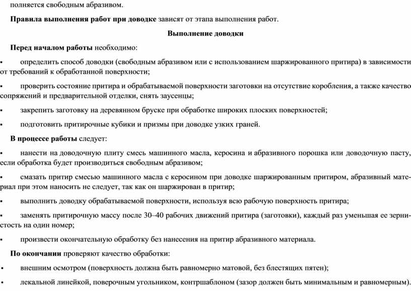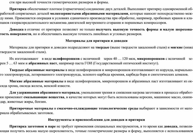 жны обеспечивать правильное взаимное расположение притира и обрабатываемой заготовки. Это может быть достигнуто при использовании стандартных приспособлений: тисков, параллелей, угольников и др. В сложных случаях применяют специальные приспособления, конструкция которых разрабатывается применительно к конкретным заготовкам. Перед началом обработки притир должен быть соответствующим образом подготовлен. Подготовка притира осуществляется двумя способами: 1. Поверхность притира натирают керосином, наносят на нее абразивный порошок и шаржируют, т. е. вдавливают зерна материала в поверхность притира, используя для этого стальной валик, если притир плоский, или стальную плиту с нанесенным на нее слоем абразивного материала, если притир конический или цилиндрический. 2. Поверхность притира покрывают слоем абразива, не подвергая ее шаржированию. В этом случае обработка выполняется свободным абразивом. Правила выполнения работ при доводке зависят от этапа выполнения работ. Выполнение доводки Перед началом работы необходимо: § определить способ доводки (свободным абразивом или с использованием шаржированного притира) в зависимости от требований к обработанной поверхности; § проверить состояние притира и обрабатываемой поверхности заготовки на отсутствие коробления, а также качество сопряжений и предварительной отделки, снять заусенцы; § закрепить заготовку на деревянном бруске при обработке широких плоских поверхностей; § подготовить притирочные кубики и призмы при доводке узких граней. В процессе работы следует: § нанести на доводочную плиту смесь машинного масла, керосина и абразивного порошка или доводочную пасту, если обработка будет производиться свободным абразивом; § смазать притир смесью машинного масла с керосином при доводке шаржированным притиром, абразивный материал при этом наносить не следует, так как он шаржирован в притир; § выполнить доводку обрабатываемой поверхности, используя всю рабочую поверхность притира; § заменять притирочную массу после 30–40 рабочих движений притира (заготовки), каждый раз уменьшая ее зернистость на один номер; § произвести окончательную обработку без нанесения на притир абразивного материала. По окончании проверяют качество обработки: § внешним осмотром (поверхность должна быть равномерно матовой, без блестящих пятен); § лекальной линейкой, поверочным угольником, контршаблоном (зазор должен быть минимальным и равномерным). Выполнение притирки Правила выполнения работ при притирке, так же, как и при доводке, соотносятся с этапами процесса обработки. Перед началом работы следует: § проверить подлежащие притирке заготовки на прямолинейность; § убедиться в качественном сопряжении притираемых заготовок; § оценить качество подготовки заготовок под притирку; § снять заусенцы и удалить царапины. В процессе притирки необходимо: § использовать метод обработки свободным абразивом, нанося на одну из притираемых поверхностей смесь из машинного масла, керосина и абразивного порошка или пасту; § совершать рабочее движение по часовой стрелке при притирке цилиндрических и конических пар; § осуществлять обработку поворотом одной сопрягаемой детали относительно другой в разные стороны на 30 … 40 и 180° при притирке пробковых кранов; § заменять периодически притирочную массу,