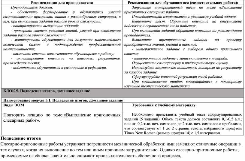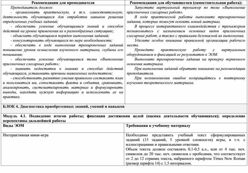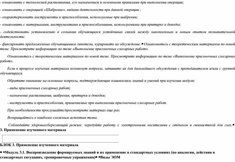 Преподаватель должен - организовать практическую, в т.ч. самостоятельную, деятельность обучающихся для отработки навыков решения определенных учебных заданий; - обеспечить усвоение обучающимися знаний и способов действий на уровне применения их в разнообразных ситуациях; - объяснить обучающимся порядок выполнения заданий; - консультировать обучающихся по мере необходимости; - обеспечить в ходе выполнения тренировочных заданий повышение уровня осмысления изученного материала, глубины его понимания; - обеспечить усвоение обучающимися темы «Выполнение пригоночных слесарных работ»; - выявить недостатки в знаниях и способах действий обучающихся, установить причины выявленных недостатков; - способствовать развитию умения правильно составлять план и пользоваться им, сопоставлять факты и события, сравнивать, анализировать, систематизировать материал и формулировать выводы, находить нужную информацию и использовать ее на практике.