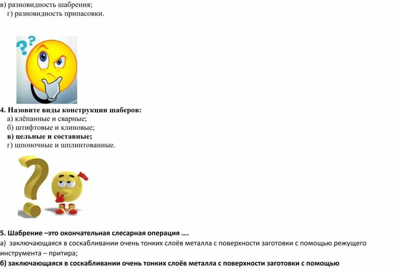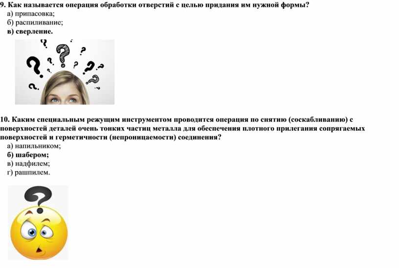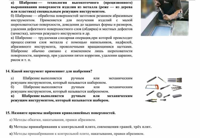 10. Каким специальным режущим инструментом проводится операция по снятию (соскабливанию) с поверхностей деталей очень тонких частиц металла для обеспечения плотного прилегания сопрягаемых поверхностей и герметичности (непроницаемости) соединения? а) напильником; б) шабером; в) надфилем; г) рашпилем.