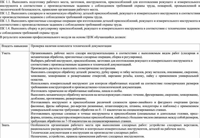 ПК 1.4. Выполнять сборку и регулировку приспособлений, режущего и измерительного инструмента в соответствии с техническим заданием с соблюдением требований охраны труда