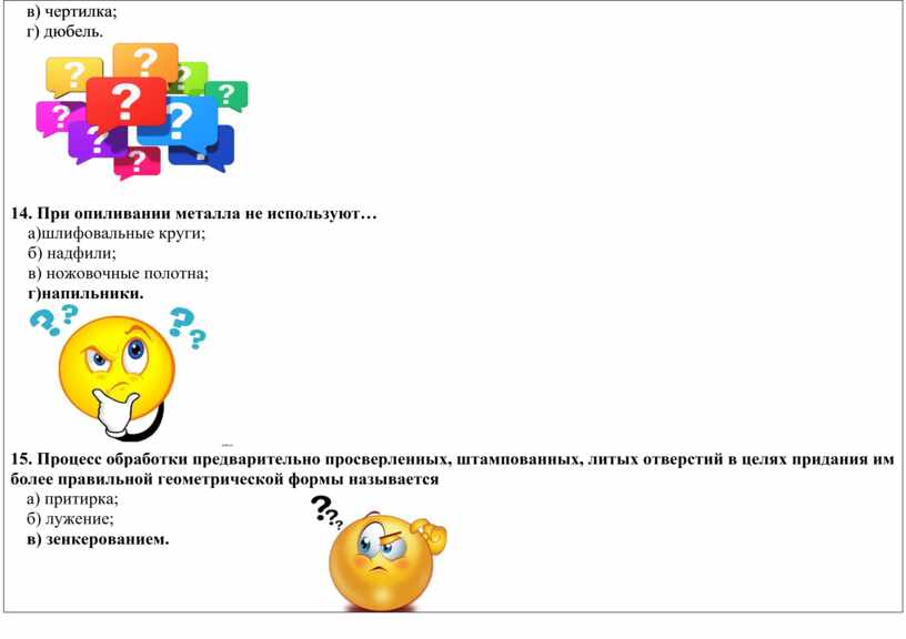 14. При опиливании металла не используют… а)шлифовальные круги; б) надфили; в) ножовочные полотна; г)напильники.