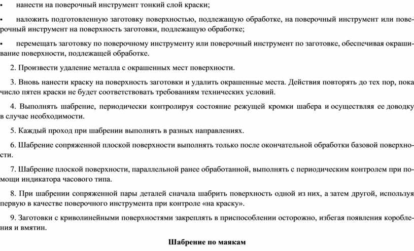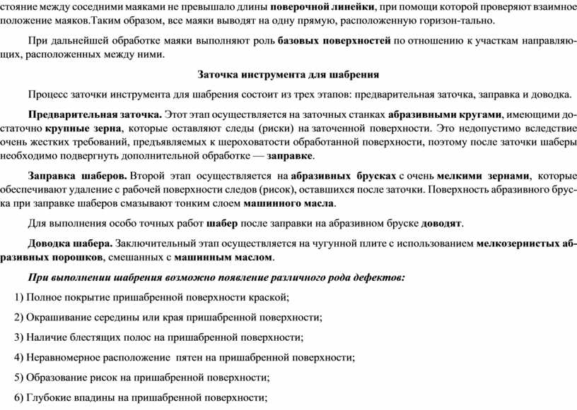 стояние между соседними маяками не превышало длины поверочной линейки, при помощи которой проверяют взаимное положение маяков.Таким образом, все маяки выводят на одну прямую, расположенную горизон-тально. При дальнейшей обработке маяки выполняют роль базовых поверхностей по отношению к участкам направляющих, расположенных между ними. Заточка инструмента для шабрения Процесс заточки инструмента для шабрения состоит из трех этапов: предварительная заточка, заправка и доводка. Предварительная заточка. Этот этап осуществляется на заточных станках абразивными кругами, имеющими достаточно крупные зерна, которые оставляют следы (риски) на заточенной поверхности. Это недопустимо вследствие очень жестких требований, предъявляемых к шероховатости обработанной поверхности, поэтому после заточки шаберы необходимо подвергнуть дополнительной обработке — заправке. Заправка шаберов. Второй этап осуществляется на абразивных брусках с очень мелкими зернами, которые обеспечивают удаление с рабочей поверхности следов (рисок), оставшихся после заточки. Поверхность абразивного бруска при заправке шаберов смазывают тонким слоем машинного масла. Для выполнения особо точных работ шабер после заправки на абразивном бруске доводят. Доводка шабера. Заключительный этап осуществляется на чугунной плите с использованием мелкозернистых абразивных порошков, смешанных с машинным маслом. При выполнении шабрения возможно появление различного рода дефектов: 1) Полное покрытие пришабренной поверхности краской; 2) Окрашивание середины или края пришабренной поверхности; 3) Наличие блестящих полос на пришабренной поверхности; 4) Неравномерное расположение пятен на пришабренной поверхности; 5) Образование рисок на пришабренной поверхности; 6) Глубокие впадины на пришабренной поверхности; 7) Наличие заусенцев и шероховатостей на поверхности; 8) Неточность во взаимном расположении пришабренных поверхностей.