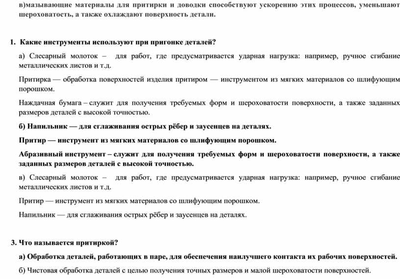 3. Что называется притиркой? а) Обработка деталей, работающих в паре, для обеспечения наилучшего контакта их рабочих поверхностей. б) Чистовая обработка деталей с целью получения точных размеров и малой шероховатости поверхностей. в) Выравнивание, счищение верхнего слоя любого материала, удаление заноз, зазубрин, иных неровностей.