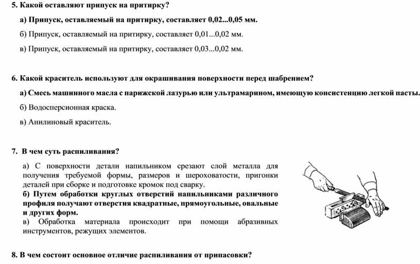 ЭОМ 2. Самостоятельная работа по теме «Выполнение пригоночных слесарных работ» Выберите правильные ответы на вопросы: 1. Почему при выполнении притирки и доводки необходимо применять смазочные материалы? а)тобы с частичек притира смывался материал притираемых деталей. б)тобы удерживать притирочный порошок. в)мазывающие материалы для притирки и доводки способствуют ускорению этих процессов, уменьшают шероховатость, а также охлаждают поверхность детали.