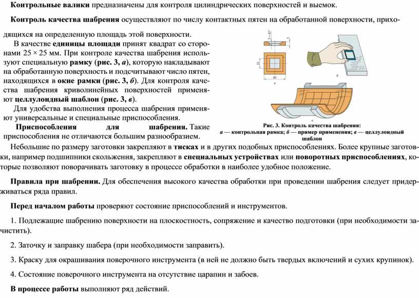 нии процесса шабрения. Поскольку шабрение является заключительной операцией слесарной обработки, то качество ее выполнения необходимо контролировать в течение всего процесса. Для этого используют поверочные инструменты. Поверочные инструменты. Применяемые при шабрении поверочные инструменты позволяют проверить плоскостность обработанных поверхностей и плотность их прилегания друг к другу. К поверочным инструментам относятся поверочные плиты и линейки, трехгранные угловые линейки, поверочные валики. Поверочные плиты используют при контроле широких плоских поверхностей. Угловые плиты обеспечивают контроль шабрения поверхностей, расположенных под прямым углом. Поверочные линейки применяют при контроле длинных и сравнительно узких поверхностей. Трехгранные угловые линейки служат для контроля шабрения поверхностей, расположенных под острым углом. Контрольные валики предназначены для контроля цилиндрических поверхностей и выемок. Контроль качества шабрения осуществляют по числу контактных пятен на обработанной поверхности, прихо-