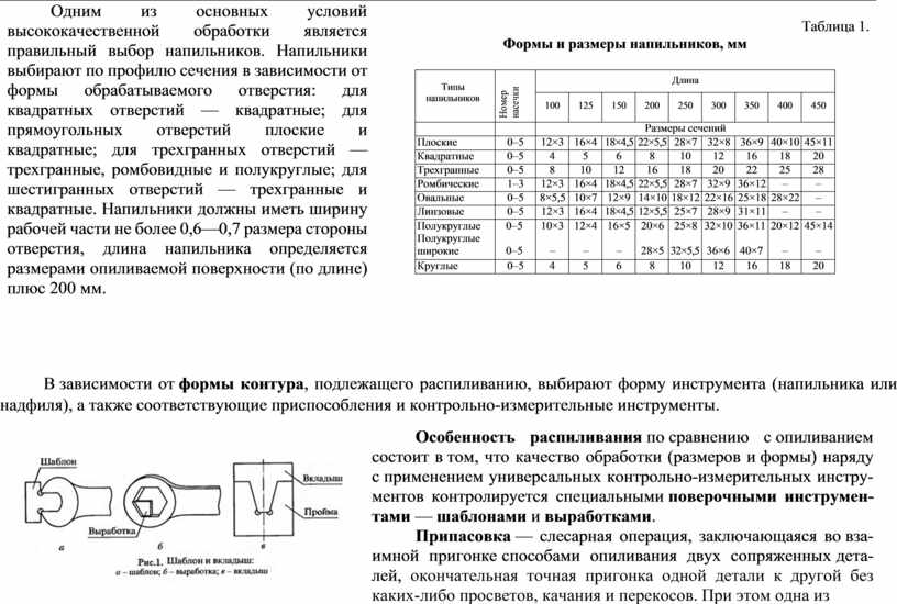 В зависимости от формы контура, подлежащего распиливанию, выбирают форму инструмента (напильника или надфиля), а также соответствующие приспособления и контрольно-измерительные инструменты.