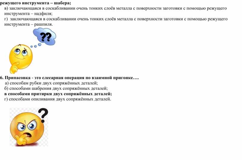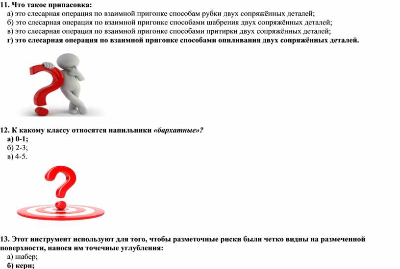 11. Что такое припасовка: а) это слесарная операция по взаимной пригонке способам рубки двух сопряжённых деталей; б) это слесарная операция по взаимной пригонке способами шабрения двух сопряжённых деталей; в) это слесарная операция по взаимной пригонке способами притирки двух сопряжённых деталей; г) это слесарная операция по взаимной пригонке способами опиливания двух сопряжённых деталей.