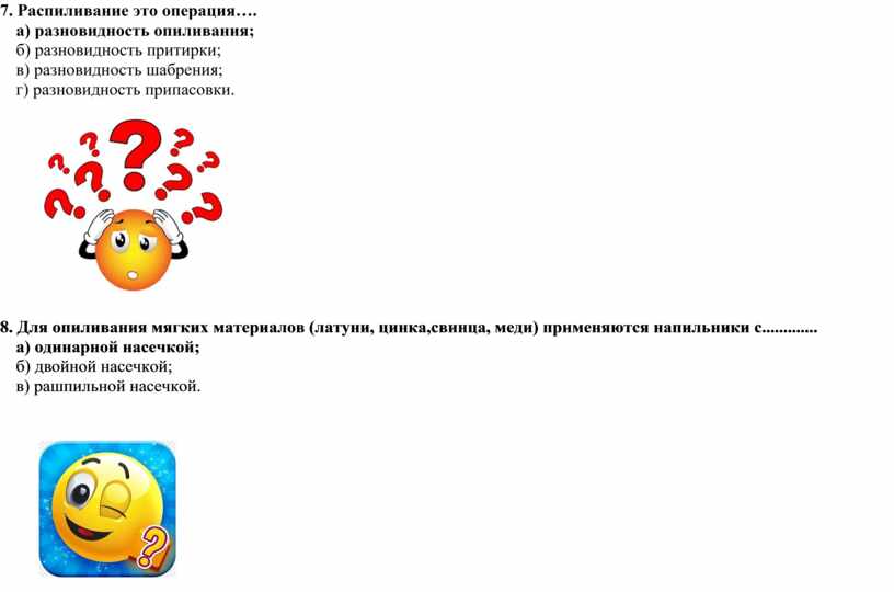 8. Для опиливания мягких материалов (латуни, цинка,свинца, меди) применяются напильники с............. а) одинарной насечкой; б) двойной насечкой; в) рашпильной насечкой.