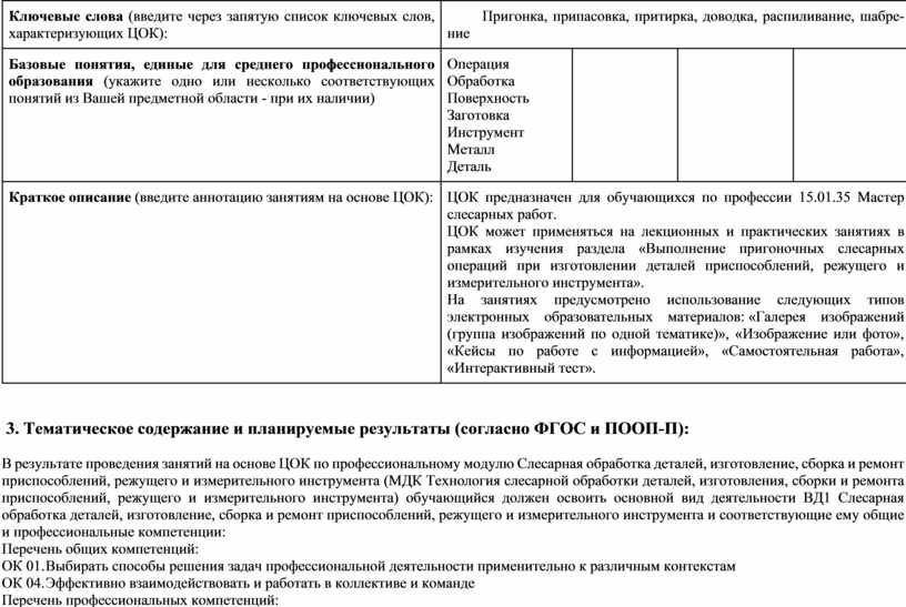 ЦОК предназначен для обучающихся по профессии 15.01.35 Мастер слесарных работ. ЦОК может применяться на лекционных и практических занятиях в рамках изучения раздела «Выполнение пригоночных слесарных операций при изготовлении деталей приспособлений, режущего и измерительного инструмента». На занятиях предусмотрено использование следующих типов электронных образовательных материалов: «Галерея изображений (группа изображений по одной тематике)», «Изображение или фото», «Кейсы по работе с информацией», «Самостоятельная работа», «Интерактивный тест». |