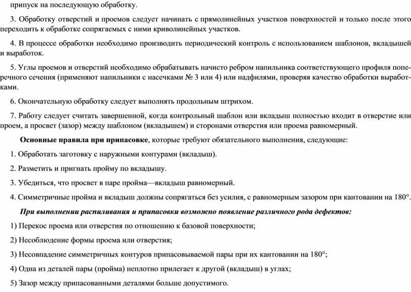 размер по форме выступа вкладыша. Точность припасовки считается достаточной, если вкладыш входит в пройму туго от руки, без просветов, качки и перекосов (рис. 3, д). Распиливание и припасовка — весьма трудоемкие слесарные операции. Однако при выполнении слесарно-сборочных, ремонтных работ, а также при окончательной обработке деталей, полученных штамповкой, выполнять эти работы приходится вручную. Применением специальных инструментов и приспособлений (ручные напильники со сменными пластинками, напильники из проволоки, покрытые алмазной крошкой, опиловочные призмы и т. д.) повышает производительность труда при распиливании и припасовке. При выполнении распиливания и припасовки для обеспечения высокого качества обработки необходимо придерживаться ряда правил. Основные правила при распиливании сводятся к следующему. 1. Способ предварительной обработки отверстия или проема выбирают в зависимости от толщины заготовки: § менее 5 мм — вырубание или выпиливание слесарной ножовкой по контуру; § более 5 мм — сверление по контуру с последующим вырубанием перемычек или рассверливание. 2. При предварительной обработке отверстий и проемов необходимо сохранять разметочные риски и оставлять припуск на последующую обработку. 3. Обработку отверстий и проемов следует начинать с прямолинейных участков поверхностей и только после этого переходить к обработке сопрягаемых с ними криволинейных участков. 4. В процессе обработки необходимо производить периодический контроль с использованием шаблонов, вкладышей и выработок. 5. Углы проемов и отверстий необходимо обрабатывать начисто ребром напильника соответствующего профиля поперечного сечения (применяют напильники с насечками № 3 или 4) или надфилями, проверяя качество обработки выработками. 6. Окончательную обработку следует выполнять продольным штрихом. 7. Работу следует считать завершенной, когда контрольный шаблон или вкладыш полностью входит в отверстие или проем, а просвет (зазор) между шаблоном (вкладышем) и сторонами отверстия или проема равномерный. Основные правила при припасовке, которые требуют обязательного выполнения, следующие: 1. Обработать заготовку с наружными контурами (вкладыш). 2. Разметить и пригнать пройму по вкладышу. 3. Убедиться, что просвет в паре пройма—вкладыш равномерный. 4. Симметричные пройма и вкладыш должны сопрягаться без усилия, с равномерным зазором при кантовании на 180°. При выполнении распиливания и припасовки возможно появление различного рода дефектов: 1) Перекос проема или отверстия по отношению к базовой поверхности; 2) Несоблюдение формы проема или отверстия; 3) Несовпадение симметричных контуров припасовываемой пары при их кантовании на 180°; 4) Одна из деталей пары (пройма) неплотно прилегает к другой (вкладыш) в углах; 5) Зазор между припасованными деталями больше допустимого.