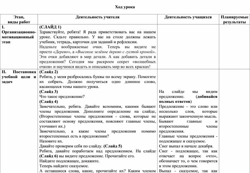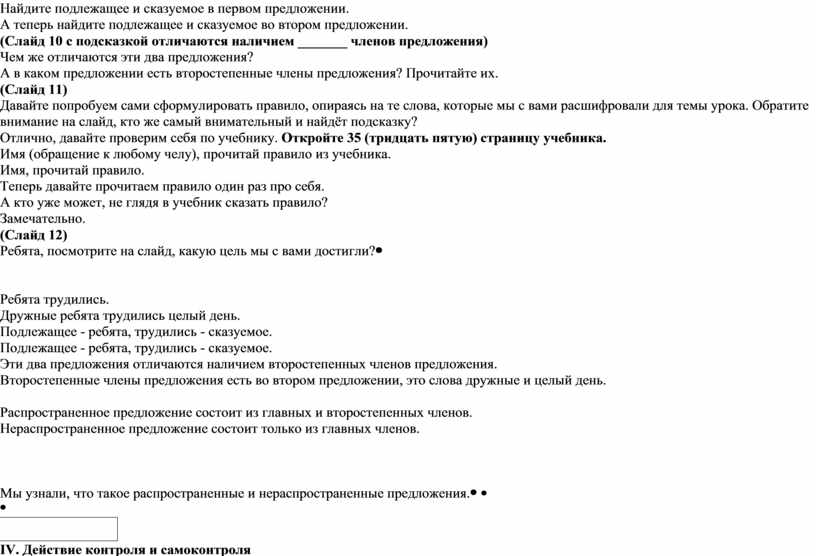 Ребята, вы молодцы! Сядьте правильно. А давайте представим, что мы - ученые, настоящие лингвисты, которые наблюдают за языком, фиксируют изменения в нём. (Слайд 9) Давайте понаблюдаем за двумя предложениями. Прочитайте их. Найдите подлежащее и сказуемое в первом предложении. А теперь найдите подлежащее и сказуемое во втором предложении. (Слайд 10 с подсказкой отличаются наличием _______ членов предложения) Чем же отличаются эти два предложения? А в каком предложении есть второстепенные члены предложения? Прочитайте их. (Слайд 11) Давайте попробуем сами сформулировать правило, опираясь на те слова, которые мы с вами расшифровали для темы урока. Обратите внимание на слайд, кто же самый внимательный и найдёт подсказку? Отлично, давайте проверим себя по учебнику. Откройте 35 (тридцать пятую) страницу учебника. Имя (обращение к любому челу), прочитай правило из учебника. Имя, прочитай правило. Теперь давайте прочитаем правило один раз про себя. А кто уже может, не глядя в учебник сказать правило? Замечательно. (Слайд 12) Ребята, посмотрите на слайд, какую цель мы с вами достигли? |
