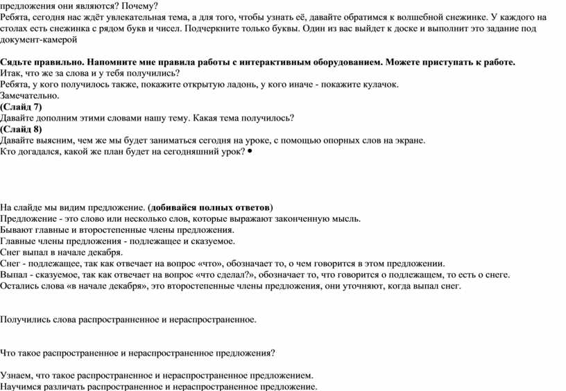 (Слайд 2) Ребята, у меня разбросались буквы по всему экрану. Помогите их собрать. Должно получиться одно длинное слово, касающееся темы нашего урока. (Слайд 3) Что такое предложение? (Слайд 4) Замечательно, ребята. Давайте вспомним, какими бывают члены предложения. Дополните определение на слайде, (Второстепенные члены предложения - слова, которые не составляют основу предложения, поясняют главные члены, уточняют их.) Замечательно, а какие члены предложения помимо второстепенных есть в предложении? Назовите их. Давайте проверим себя по слайду. (Слайд 5) Ребята, давайте поработаем над предложением. На слайде (Слайд 6) вы видите предложение. Прочитайте его. Найдите подлежащее, докажите. Теперь найдите сказуемое. А оставшиеся слова, какие, прочитайте их? Каким членом предложения они являются? Почему? Ребята, сегодня нас ждёт увлекательная тема, а для того, чтобы узнать её, давайте обратимся к волшебной снежинке. У каждого на столах есть снежинка с рядом букв и чисел. Подчеркните только буквы. Один из вас выйдет к доске и выполнит это задание под документ-камерой