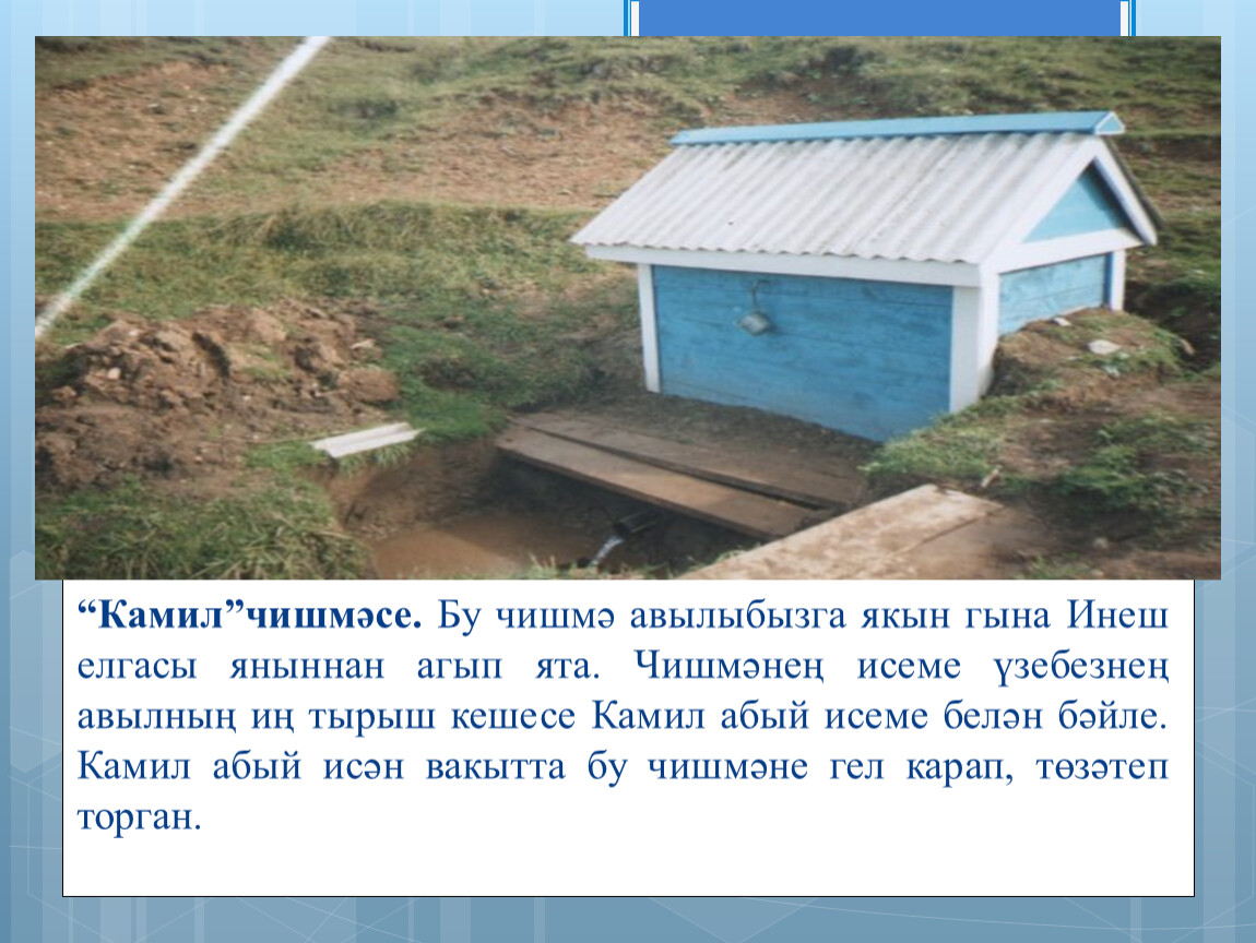 “Камил”чишмәсе. Бу чишмә авылыбызга якын гына Инеш елгасы яныннан агып ята. Чишмәнең исеме үзебезнең авылның иң тырыш кешесе Камил абый исеме белән бәйле. Камил абый исән вакытта бу чишмәне гел карап, төзәтеп торган.