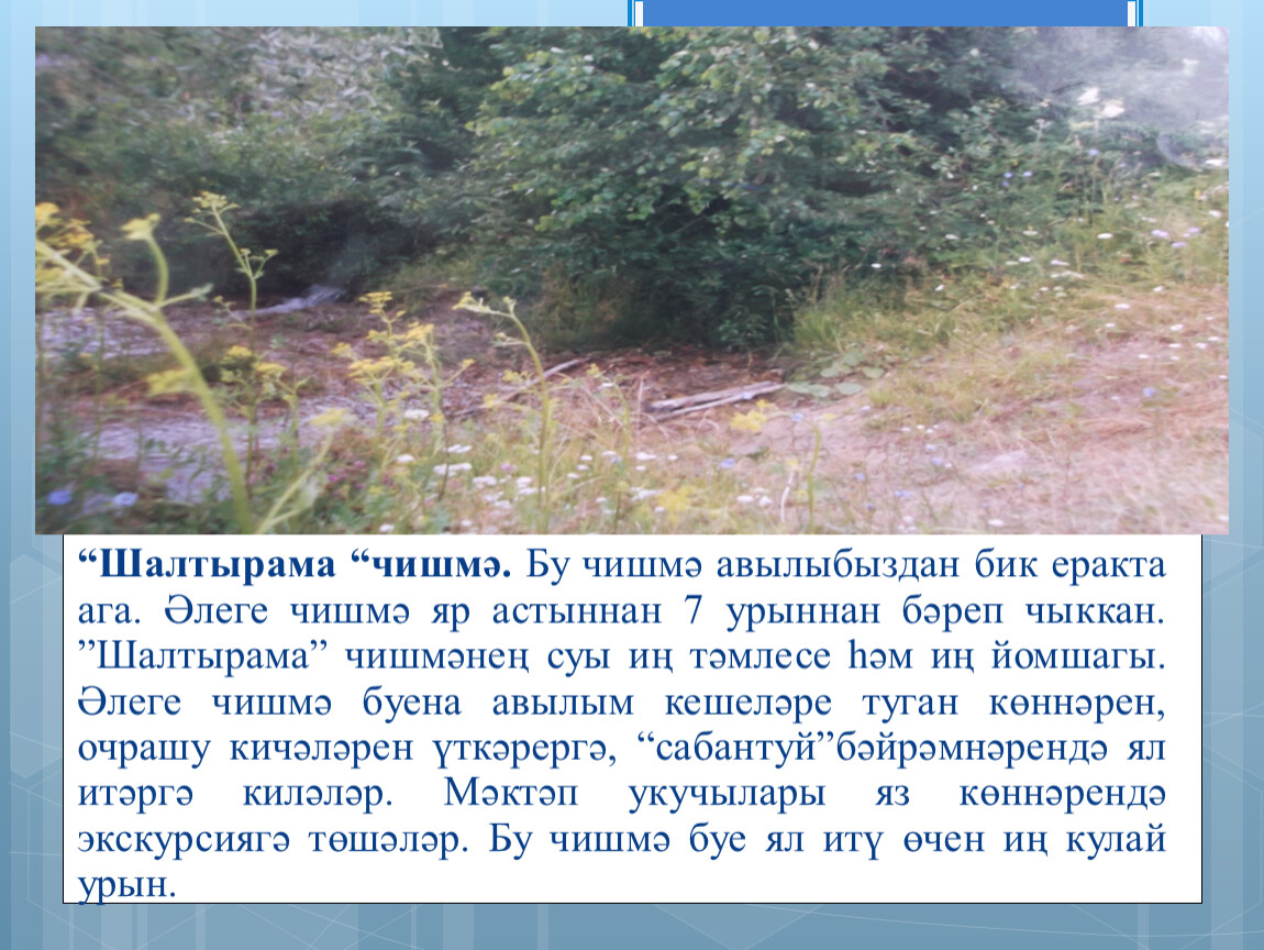 “Шалтырама “чишмә. Бу чишмә авылыбыздан бик еракта ага. Әлеге чишмә яр астыннан 7 урыннан бәреп чыккан. ”Шалтырама” чишмәнең суы иң тәмлесе һәм иң йомшагы. Әлеге чишмә буена авылым кешеләре туган көннәрен, очрашу кичәләрен үткәрергә, “сабантуй”бәйрәмнәрендә ял итәргә киләләр. Мәктәп укучылары яз көннәрендә экскурсиягә төшәләр. Бу чишмә буе ял итү өчен иң кулай урын.