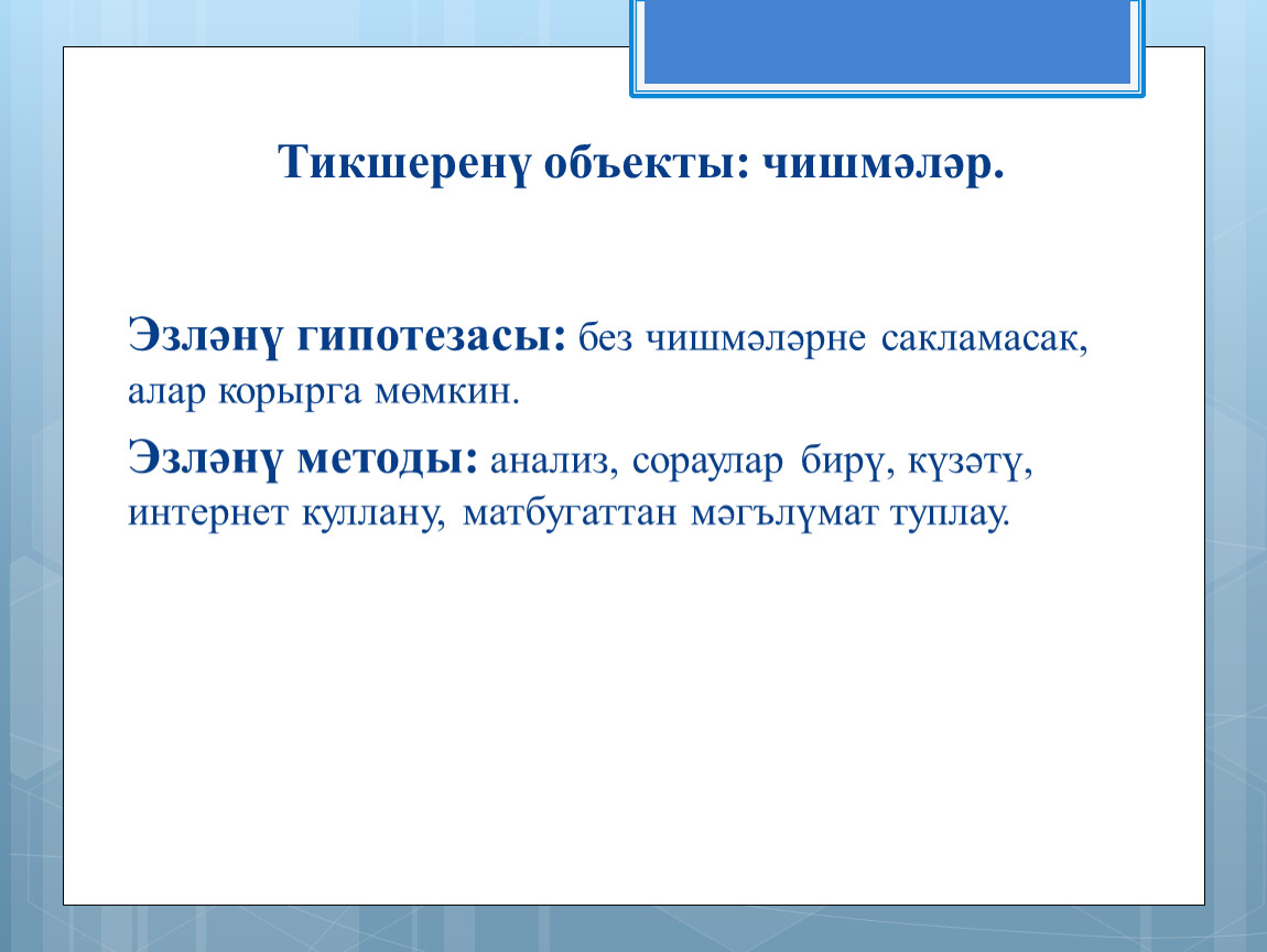 Эзләнү методы: анализ, сораулар бирү, күзәтү, интернет куллану, матбугаттан мәгълүмат туплау.