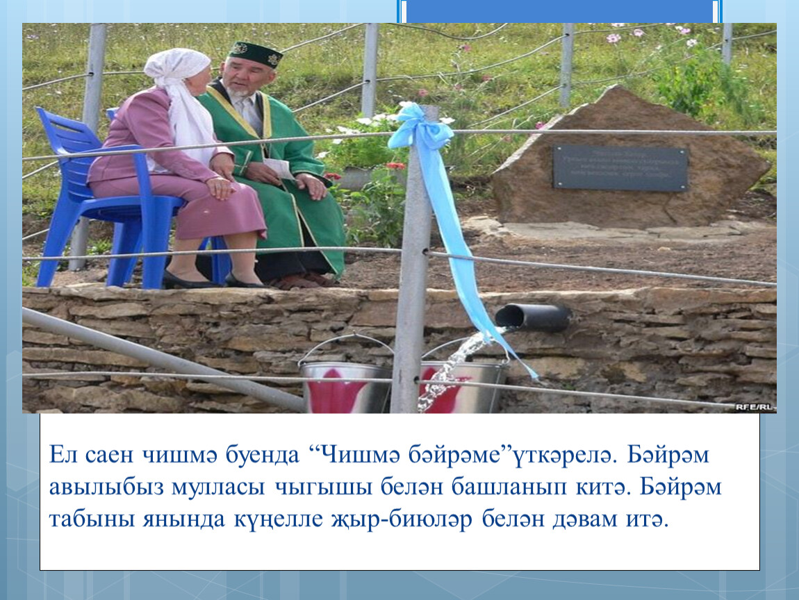 Ел саен чишмә буенда “Чишмә бәйрәме”үткәрелә. Бәйрәм авылыбыз мулласы чыгышы белән башланып китә. Бәйрәм табыны янында күңелле җыр-биюләр белән дәвам итә.
