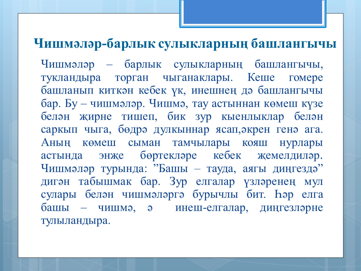 Чишмәләр – барлык сулыкларның башлангычы, тукландыра торган чыганаклары. Кеше гомере башланып киткән кебек үк, инешнең дә башлангычы бар. Бу – чишмәләр. Чишмә, тау астыннан көмеш күзе белән җирне тишеп, бик зур кыенлыклар белән саркып чыга, бөдрә дулкыннар ясап,әкрен генә ага. Аның көмеш сыман тамчылары кояш нурлары астында энҗе бөртекләре кебек җемелдиләр. Чишмәләр турында: ”Башы – тауда, аягы диңгездә” дигән табышмак бар. Зур елгалар үзләренең мул сулары белән чишмәләргә бурычлы бит. Һәр елга башы – чишмә, ә инеш-елгалар, диңгезләрне тулыландыра.