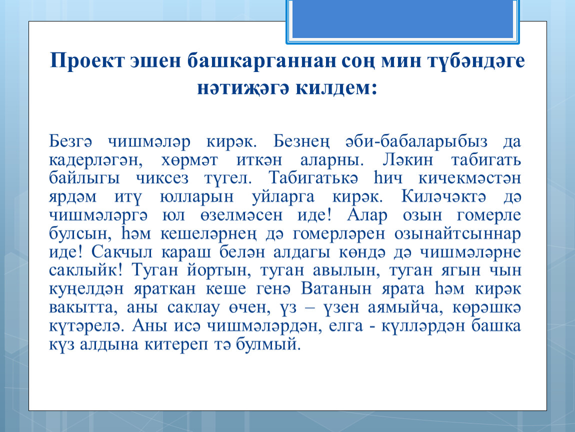 Проект эшен башкарганнан соң мин түбәндәге нәтиҗәгә килдем:
