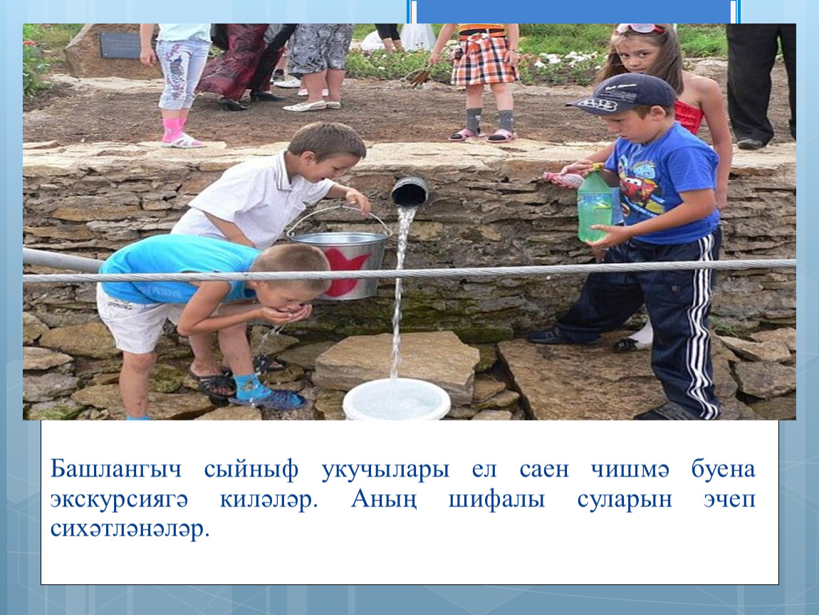 Башлангыч сыйныф укучылары ел саен чишмә буена экскурсиягә киләләр. Аның шифалы суларын эчеп сихәтләнәләр.
