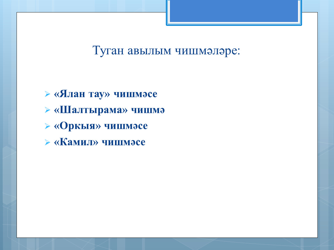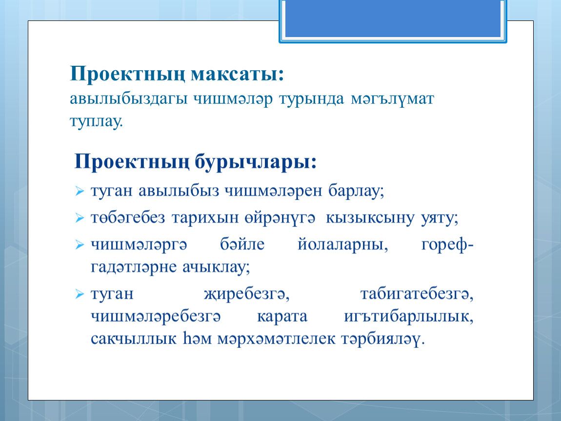 Проектның максаты:авылыбыздагы чишмәләр турында мәгълүмат туплау.