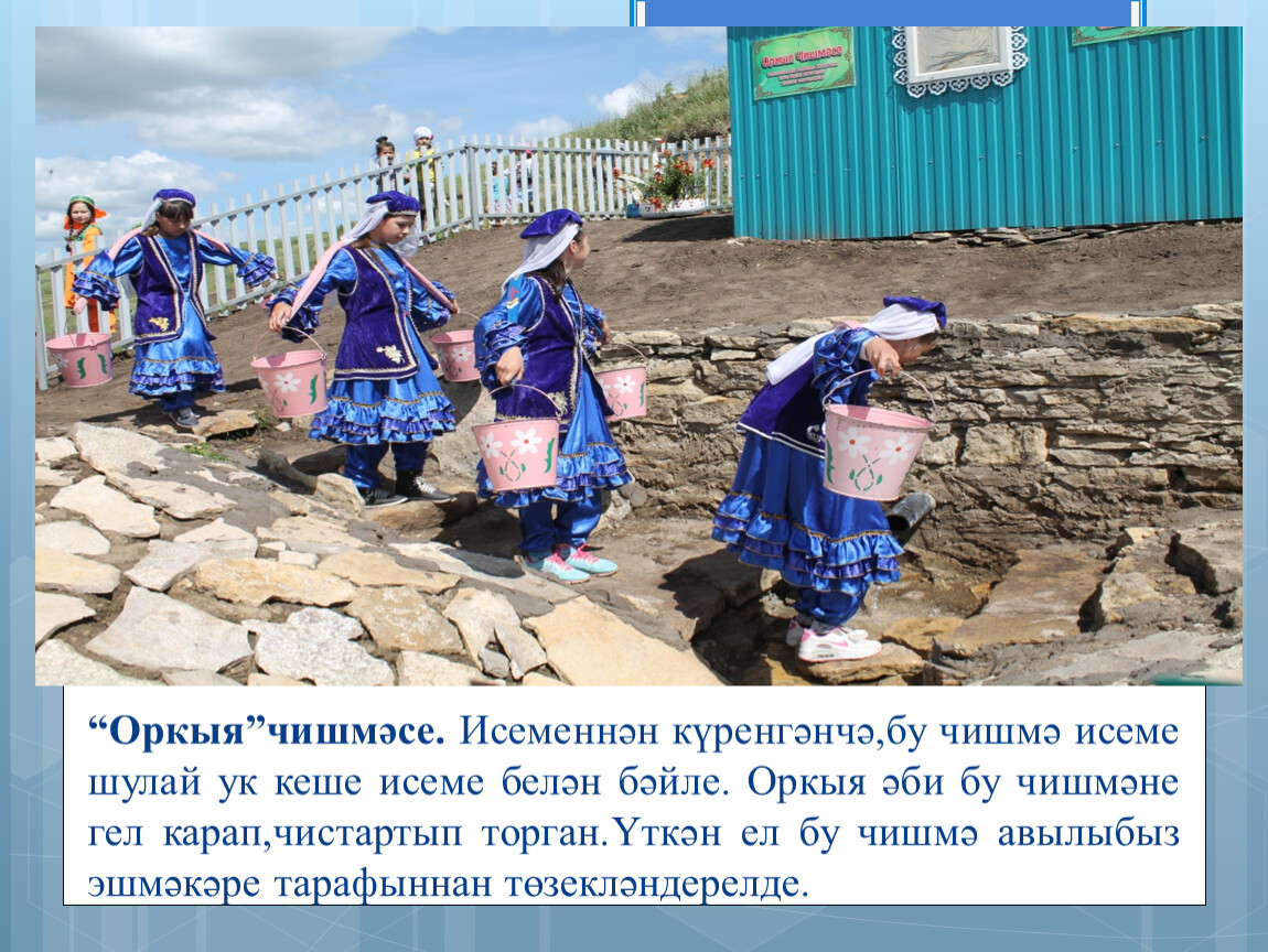 “Оркыя”чишмәсе. Исеменнән күренгәнчә,бу чишмә исеме шулай ук кеше исеме белән бәйле. Оркыя әби бу чишмәне гел карап,чистартып торган.Үткән ел бу чишмә авылыбыз эшмәкәре тарафыннан төзекләндерелде.