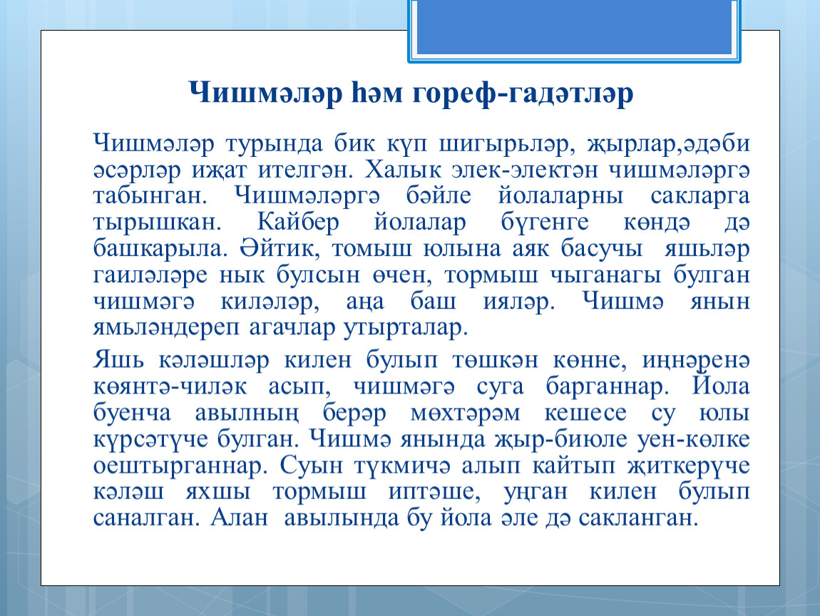 Йөрәккә нинди якын һәм кадерле бу сүзләр. Безнең һәрберебезнең газиз туган йорты, нигезебез урнашкан кадерле туган авылы бар. Һәр авылның үзенә генә хас кабатланмас, истә кала торган урыннары күп. Авылым чишмәләре шуларның берсе.