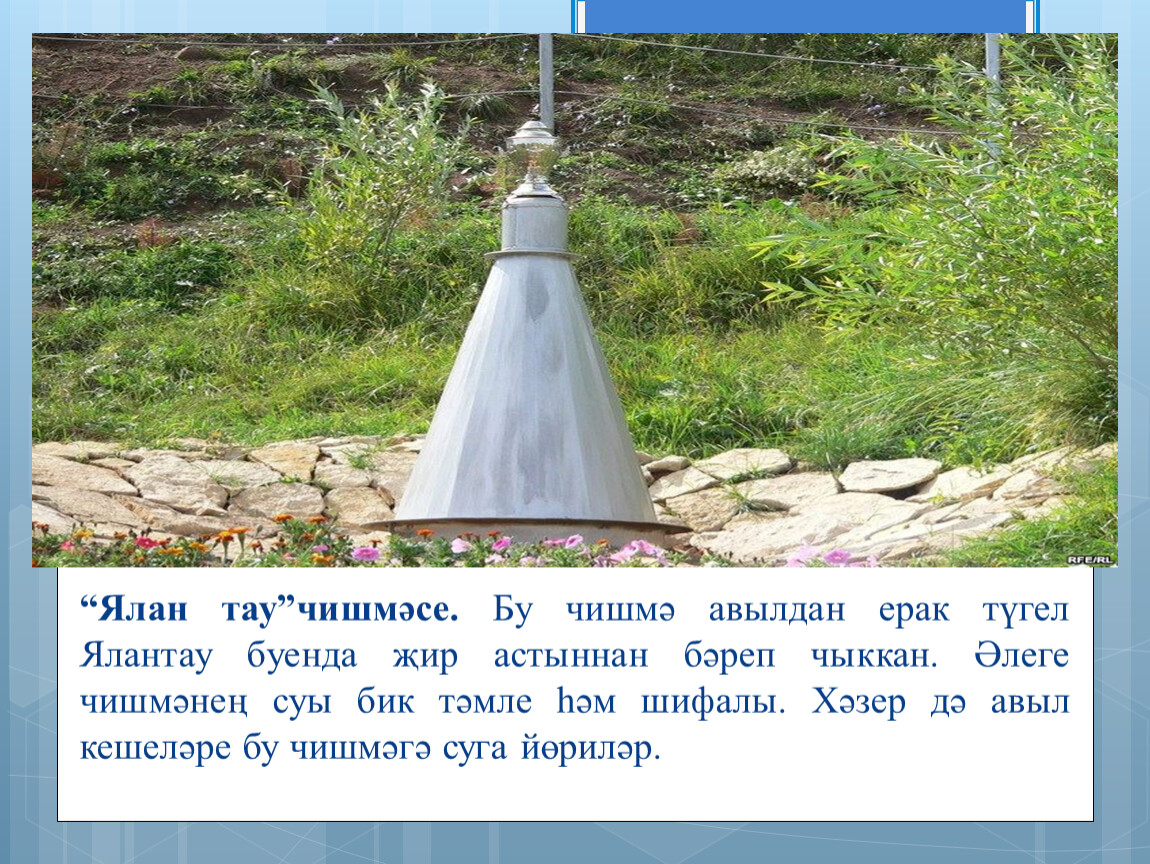 “Ялан тау”чишмәсе. Бу чишмә авылдан ерак түгел Ялантау буенда җир астыннан бәреп чыккан. Әлеге чишмәнең суы бик тәмле һәм шифалы. Хәзер дә авыл кешеләре бу чишмәгә суга йөриләр.