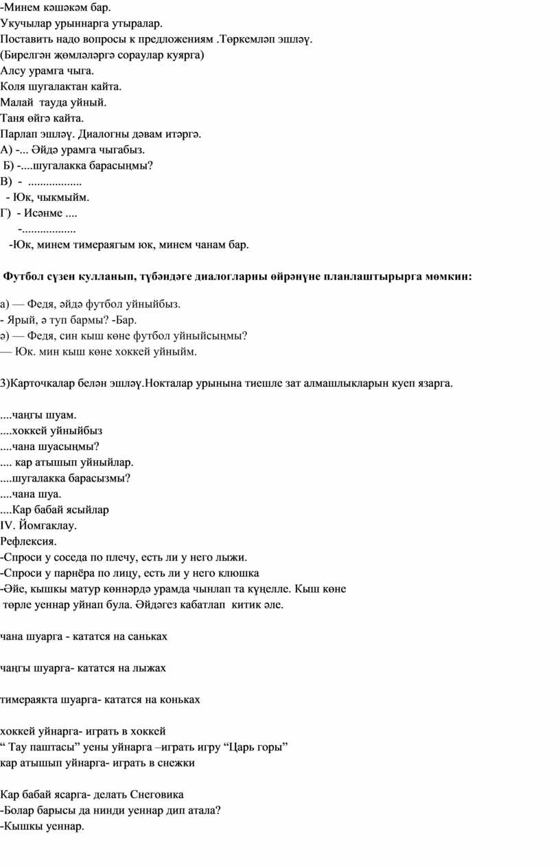 Максат: -яңа лексик берәмлекләр исәбенә укучыларның сүзлек байлыгын арттыру; Кая? кайда? кайдан? сорауларына җавап бирә белүне камилләштерү. Әйе, юк, түгел сүзләрен дөрес куллана белү; сорау кисәкчәләрен куллану күнекмәләрен ныгыту. Чана, чаңгы сүзләренең берлек санда тартым белән төрләнеше белән таныштыру.Укучыларның тыңлап аңлау, диалогик һәм монологик сөйләм күнекмәләрен үстерү,сүзләрне үзләштерү дәрәҗәсен билгеләү.Сәламәт яшәү рәвеше, дуслык хисе тәрбияләү.