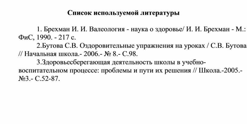 1. Брехман И. И. Валеология - наука о здоровье/ И. И. Брехман - М.: ФиС, 1990. - 217 с.