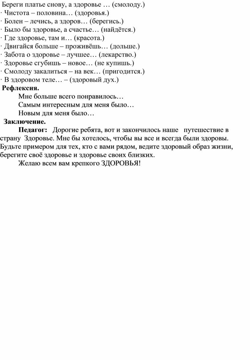 Педагог: Дорогие ребята, вот и закончилось наше путешествие в страну Здоровье. Мне бы хотелось, чтобы вы все и всегда были здоровы. Будьте примером для тех, кто с вами рядом, ведите здоровый образ жизни, берегите своё здоровье и здоровье своих близких.
