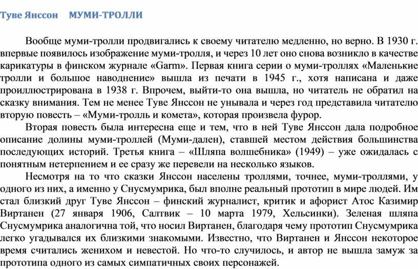 Вообще муми-тролли продвигались к своему читателю медленно, но верно. В 1930 г. впервые появилось изображение муми-тролля, и через 10 лет оно снова возникло в качестве карикатуры в финском журнале «Garm». Первая книга серии о муми-троллях «Маленькие тролли и большое наводнение» вышла из печати в 1945 г., хотя написана и даже проиллюстрирована в 1938 г. Впрочем, выйти-то она вышла, но читатель не обратил на сказку внимания. Тем не менее Туве Янссон не унывала и через год представила читателю вторую повесть – «Муми-тролль и комета», которая произвела фурор.