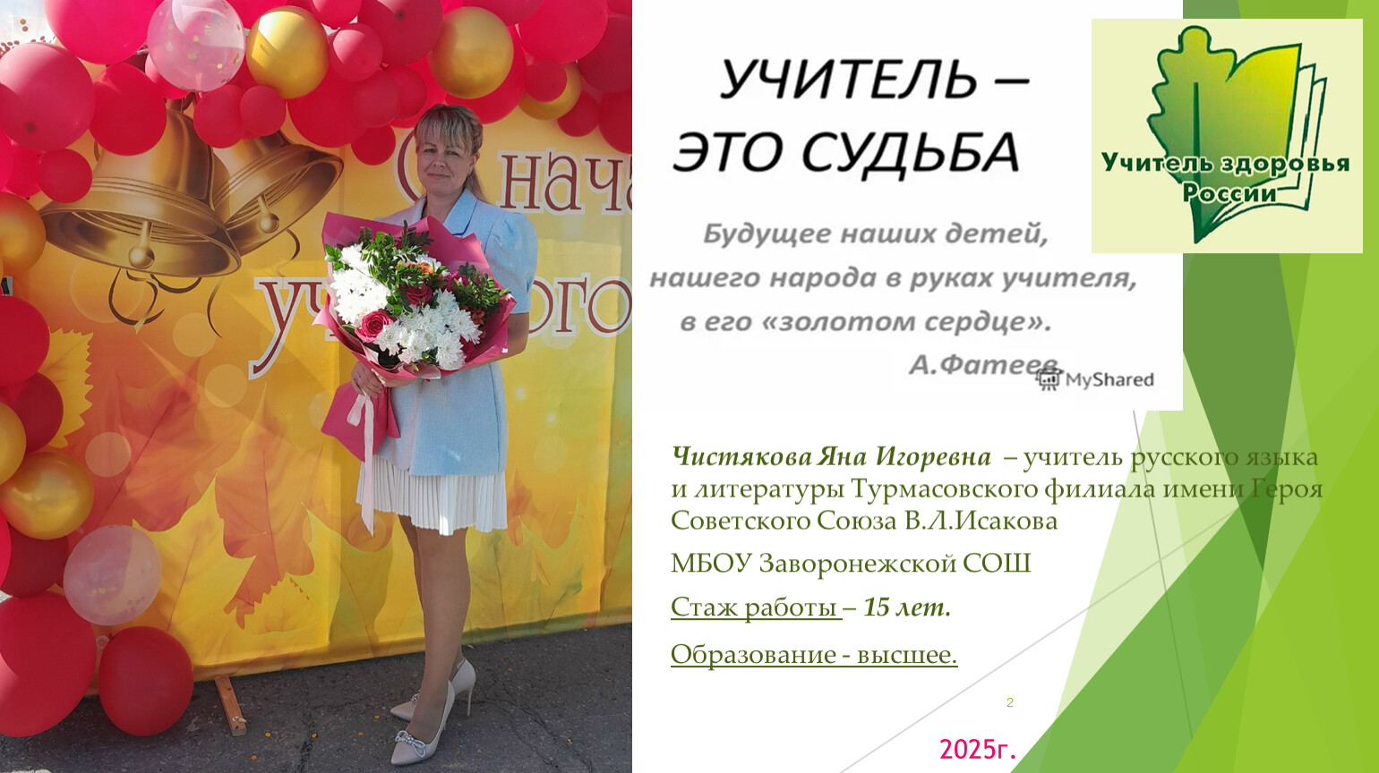 Чистякова Яна Игоревна – учитель русского языка и литературы Турмасовского филиала имени Героя Советского Союза В.Л.Исакова