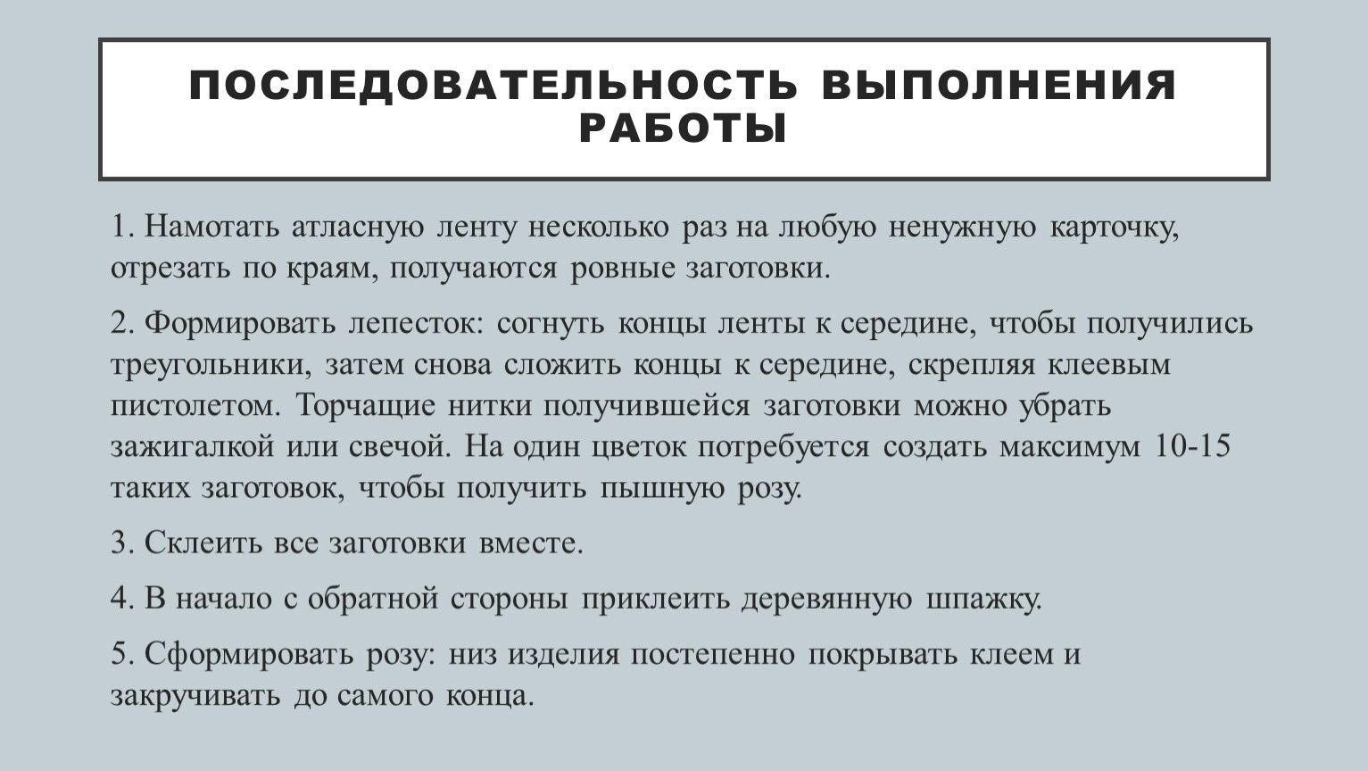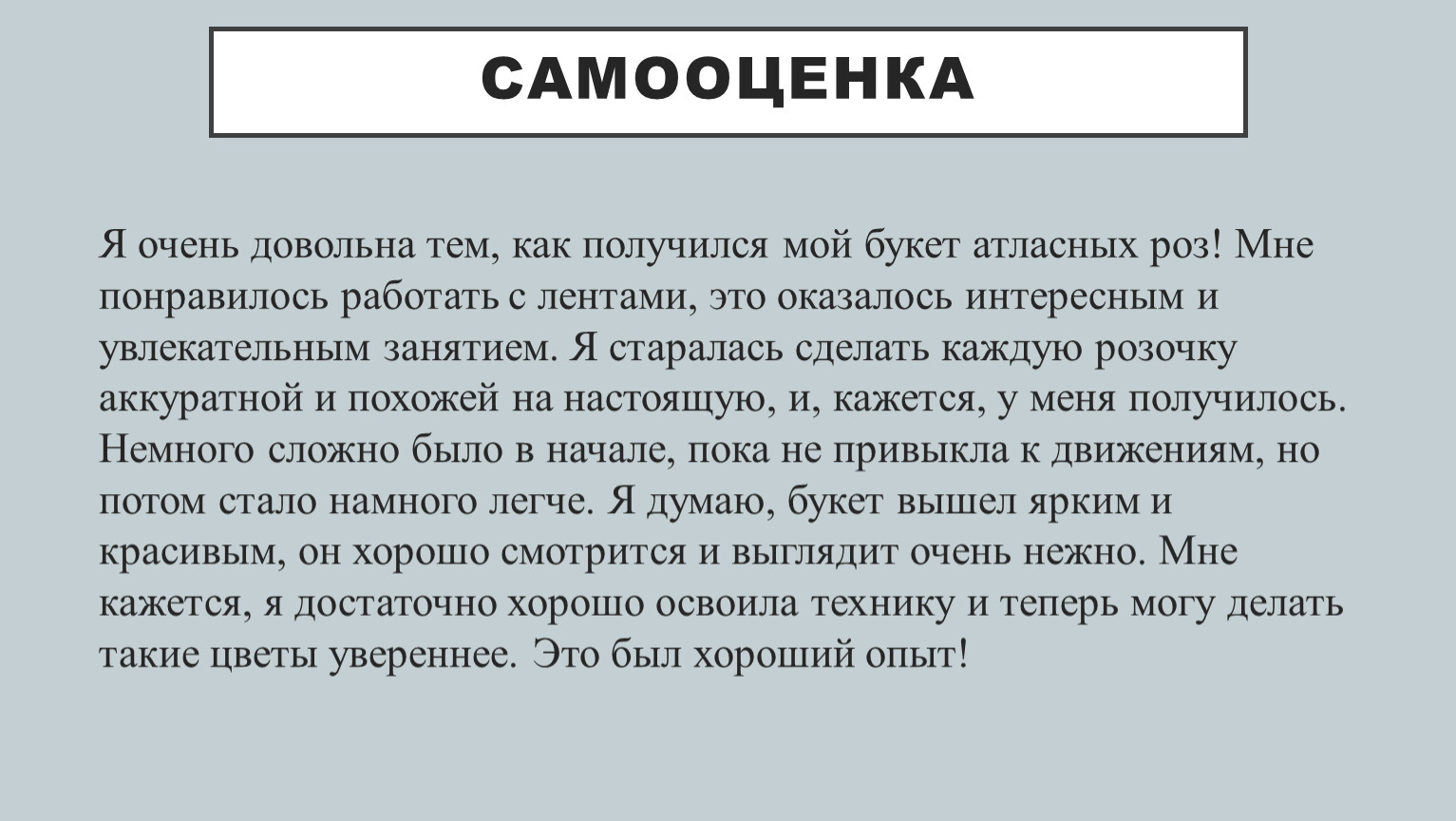 Я очень довольна тем, как получился мой букет атласных роз! Мне понравилось работать с лентами, это оказалось интересным и увлекательным занятием. Я старалась сделать каждую розочку аккуратной и похожей на настоящую, и, кажется, у меня получилось. Немного сложно было в начале, пока не привыкла к движениям, но потом стало намного легче. Я думаю, букет вышел ярким и красивым, он хорошо смотрится и выглядит очень нежно. Мне кажется, я достаточно хорошо освоила технику и теперь могу делать такие цветы увереннее. Это был хороший опыт!