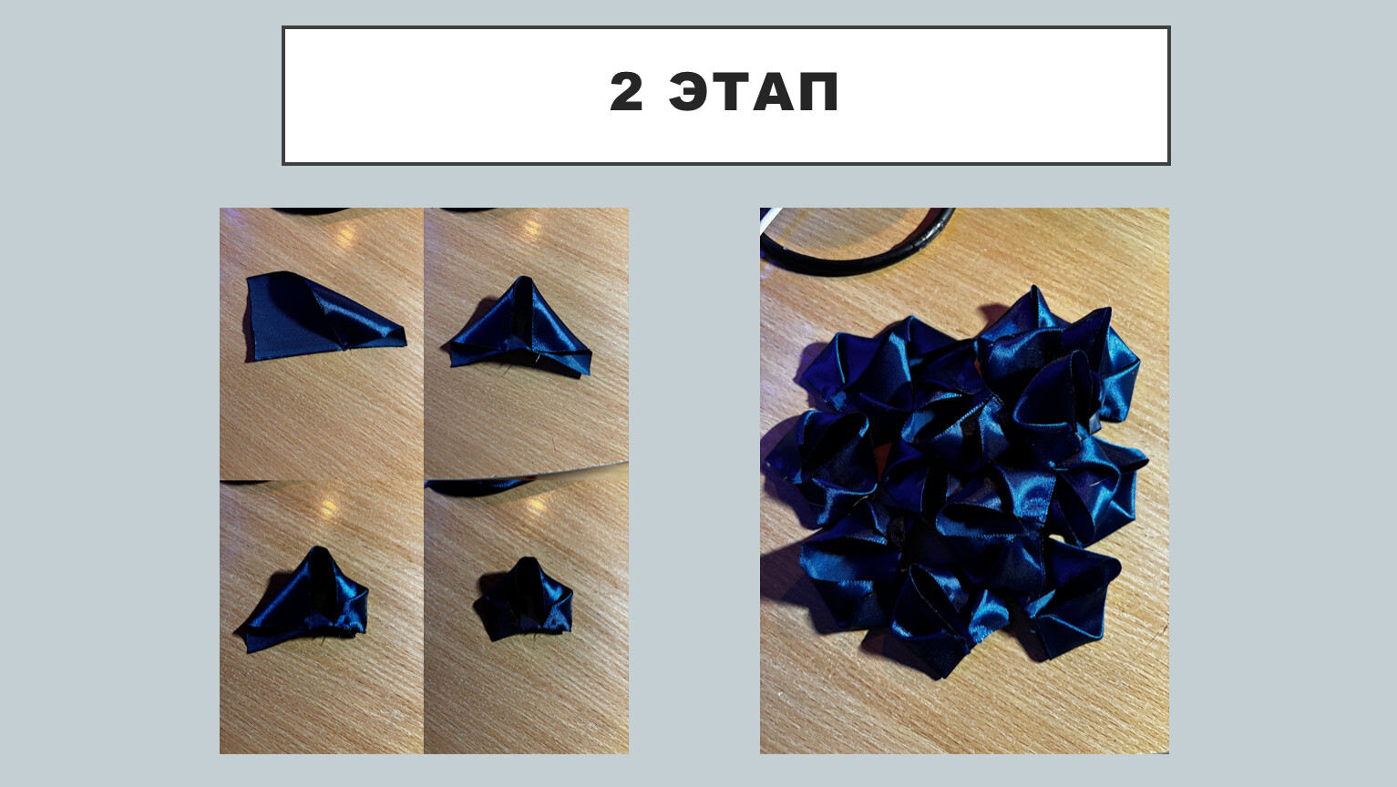 2. Формировать лепесток: согнуть концы ленты к середине, чтобы получились треугольники, затем снова сложить концы к середине, скрепляя клеевым пистолетом. Торчащие нитки получившейся заготовки можно убрать зажигалкой или свечой. На один цветок потребуется создать максимум 10-15 таких заготовок, чтобы получить пышную розу.