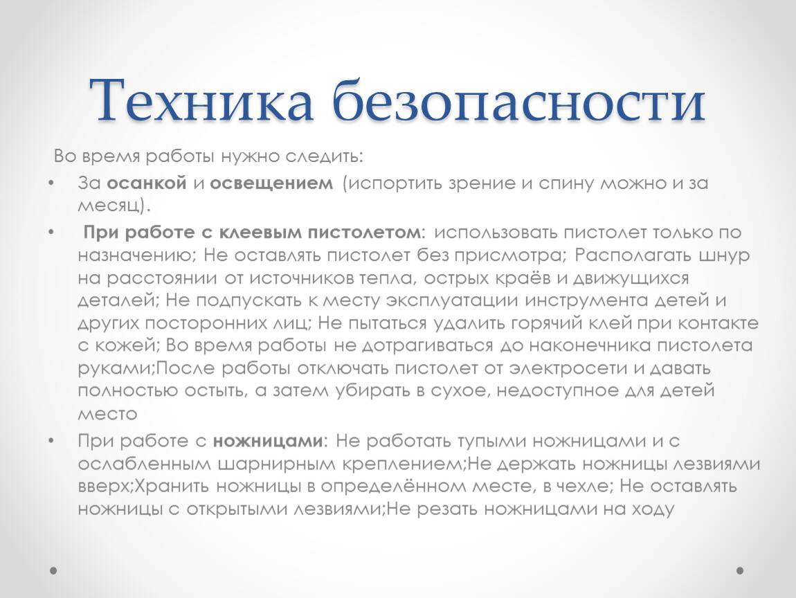 При работе с клеевым пистолетом: использовать пистолет только по назначению; Не оставлять пистолет без присмотра; Располагать шнур на расстоянии от источников тепла, острых краёв и движущихся деталей; Не подпускать к месту эксплуатации инструмента детей и других посторонних лиц; Не пытаться удалить горячий клей при контакте с кожей; Во время работы не дотрагиваться до наконечника пистолета руками;После работы отключать пистолет от электросети и давать полностью остыть, а затем убирать в сухое, недоступное для детей место